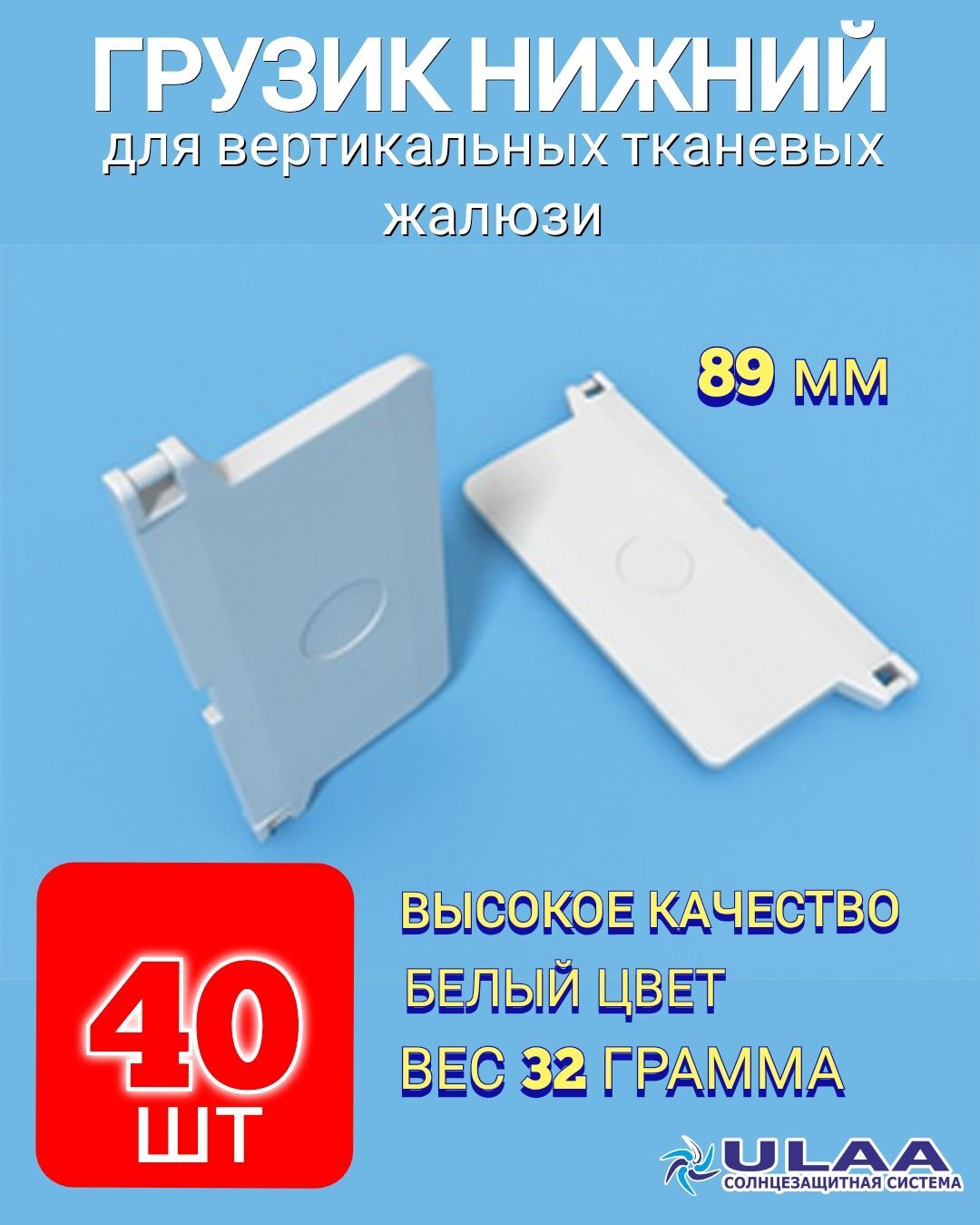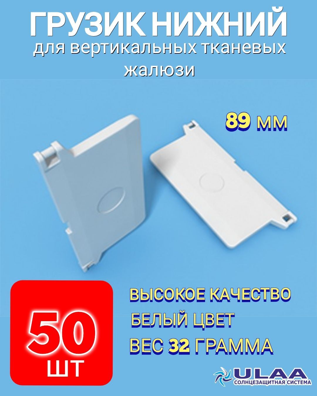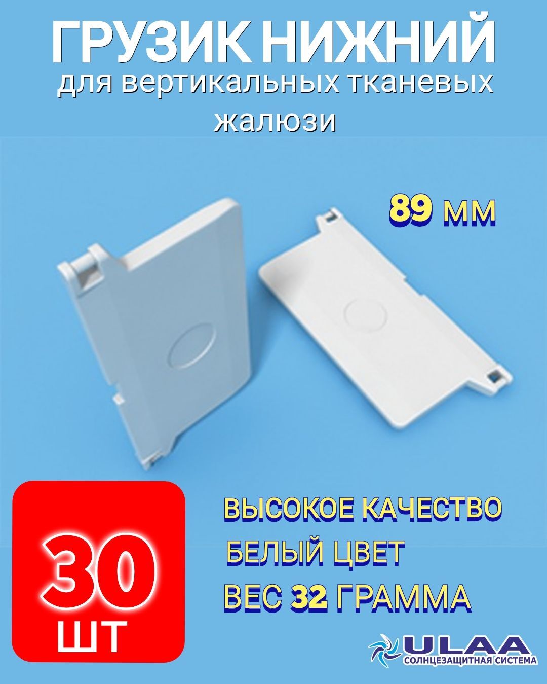 Грузик нижний для ткани - цвет белый. Материал изготовления грузика пластик, устойчивый к ультрафиолету. Вес грузика 32 грамма. Форма грузика прямоугольная с двумя ушками под цепочку.